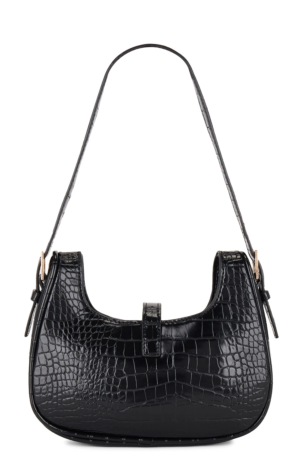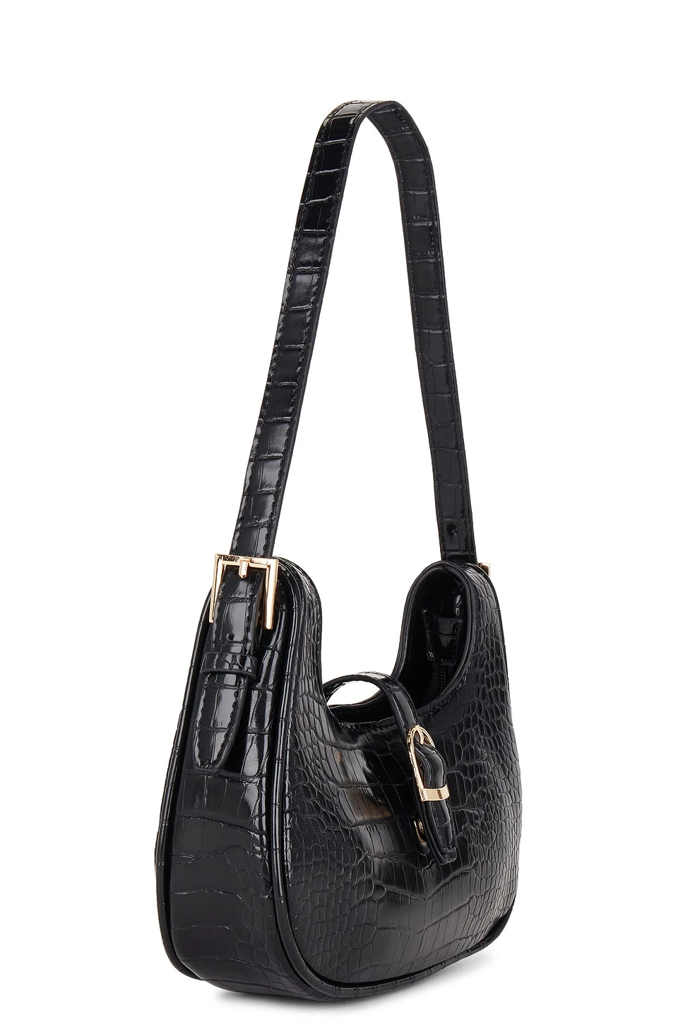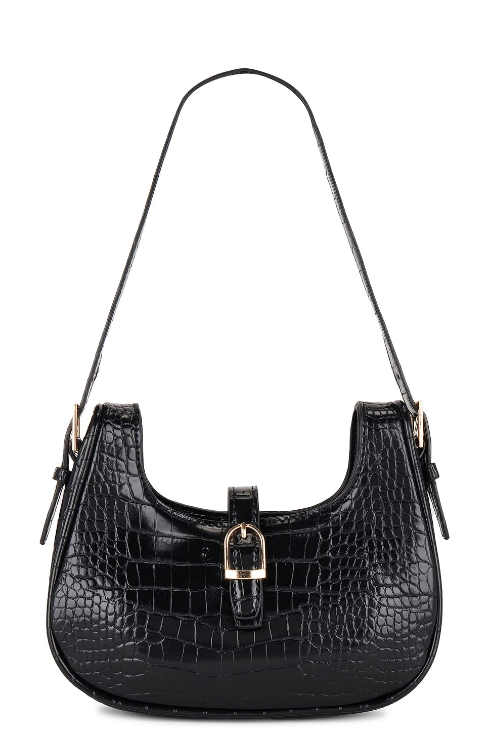 - Top zipper with gold-tone buckled strap and magnetic button closure