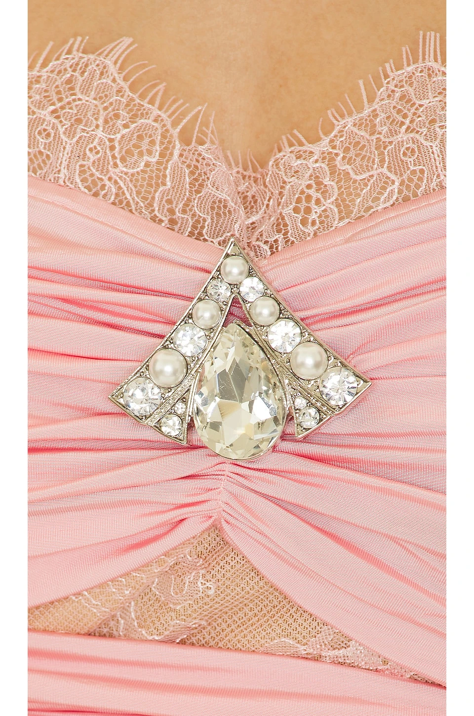 Jersey and lace fabric with crystal embellished accent at bust - Neckline to hem measures approx 25″ in length