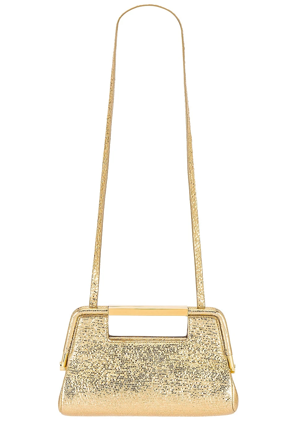 - Snake-embossed metallic leather with canvas lining and gold-tone hardware