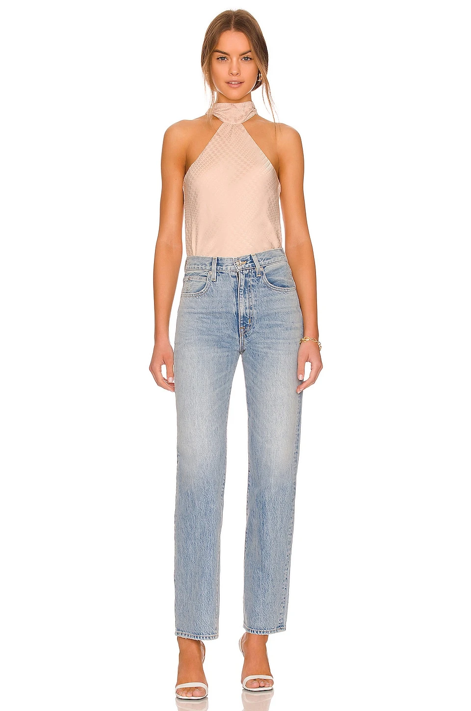 - Halter neckline with button loop closure